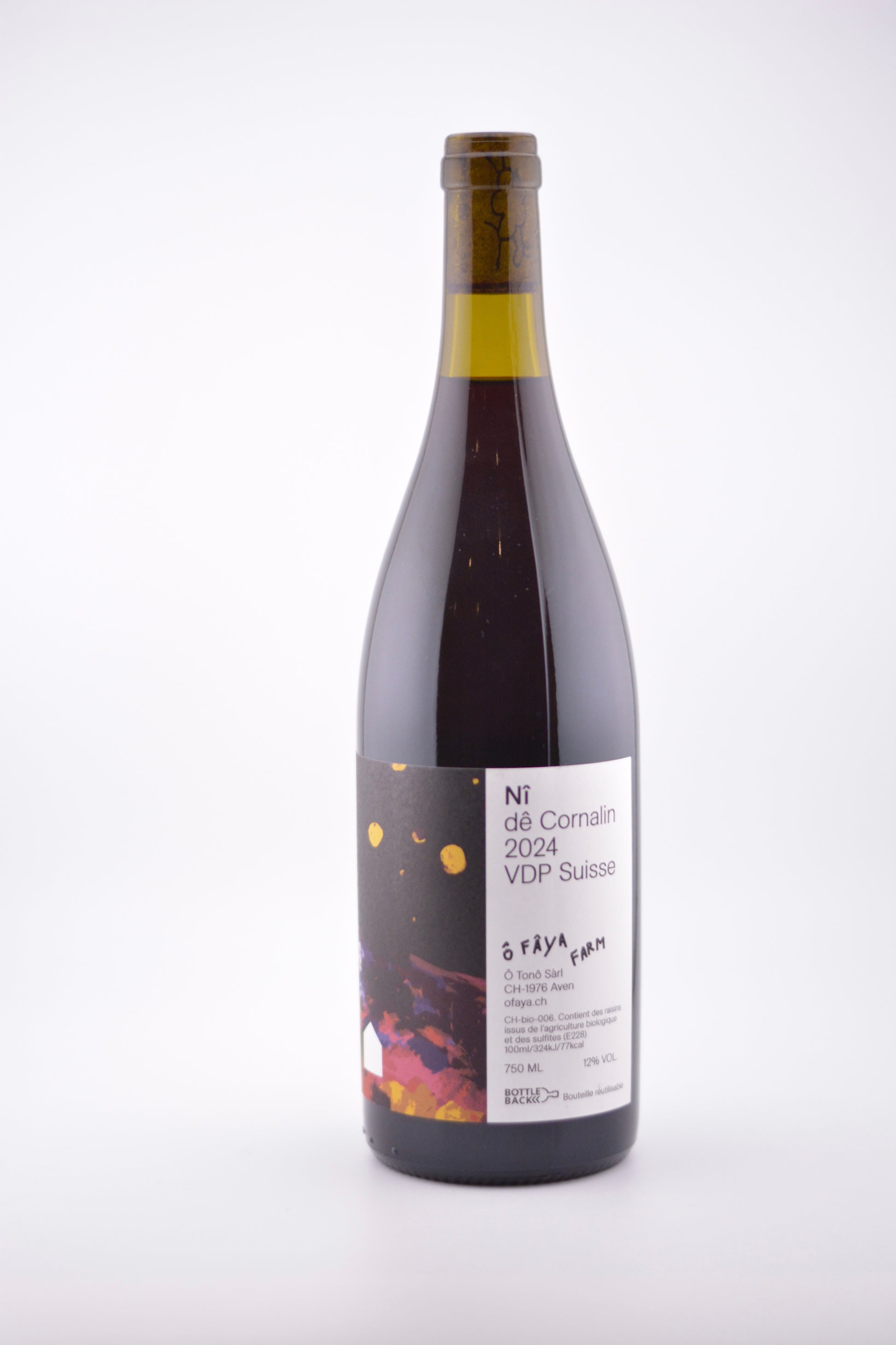 Un Cornalin pur jus, sans maquillage, qui assume son caractère montagnard. Nî dê Cornalin, c’est la version Ô Fâya Farm d’un cépage valaisan célèbre pour son tempérament : un rouge capricieux, vif, parfois un peu sauvage — mais qui, lorsqu’on le respecte, peut être d’une beauté rare.