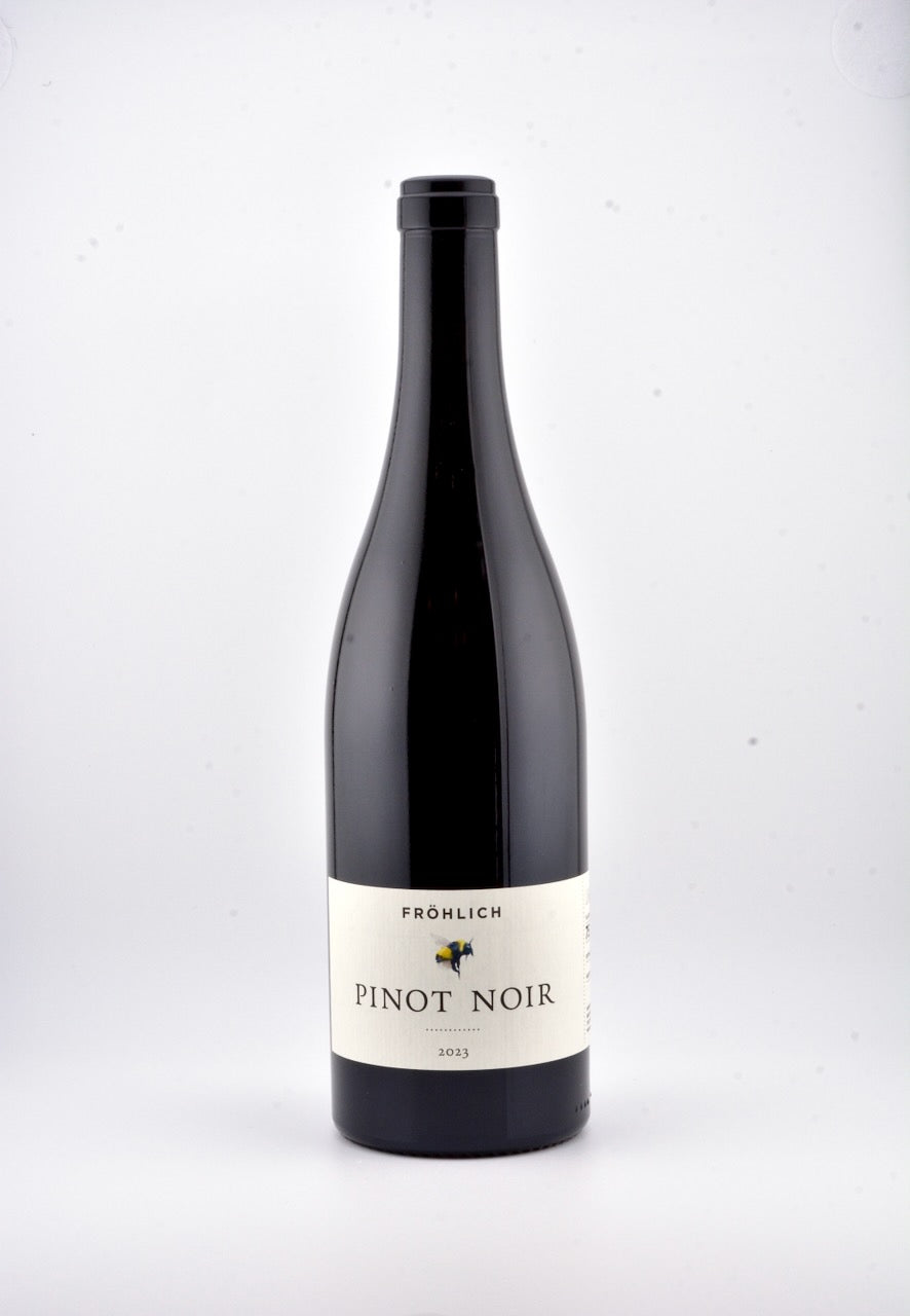 Ce Pinot 2023 impose son rythme : vendanges plus chaudes suivies de nuits fraîches exposées au Föhn, favorisant un fruit mûr et énergétique. Nez vibrant sur la groseille, la framboise et une nuance épicée. 20 % grappes entières, fermentation naturelle, élevage subtil. En bouche, le fruit explose sans excès, soutenu par des tanins fins et une acidité rafraîchissante — signature d’un millésime solaire mais équilibré. Parfait autour d’un magret aux épices ou d’un plat végétal relevé. Ce Pinot est à la fois l’élan du 2023 et l’harmonie profonde chère à Sven Fröhlich : solaire, précis et parfaitement accordé.
